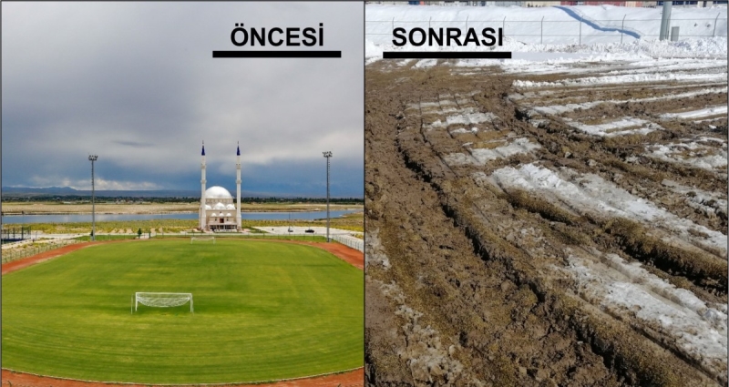 Mevcut görüntüsü ile patates tarlasını aratmayan stat, kar temizlemesi yapıldığı iddia edilen iş makinaları tarafından resmen patates tarlasına döndürüldü. Adıyaman FK Sportif Direktörü Alper Aslan’ın paylaşım ve konuşmalarında ‘Stat patates tarlasına dönmüş’ sözleri güne damga vurdu.
