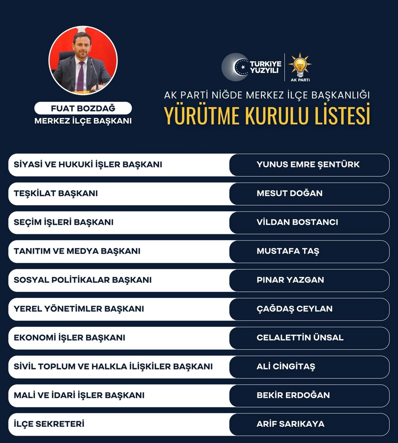 Merkez İlçe Başkanı Fuat Bozdağ başkanlığında oluşturulan yeni yönetim, şehrin siyasi ve sosyal dinamiklerini kapsayan bir yapıyla göreve başladı. Başkan Bozdağ, yeni ekibin vizyonunu "Durmak yok, yola devam" sloganıyla özetlerken, kadronun Niğde’ye hizmet noktasında tam motivasyonla hazır olduğunu ifade etti.