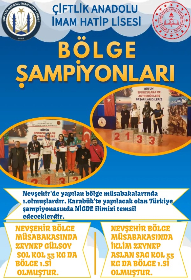 Nevşehir ilinde yapılan bilek güreşi bölge müsabakalarinda 55 kilo sol kolda Zeynep Gülsoy, 55 kilo sağ kolda İklim Zeynep Aslan rakiplerini eleyerek bölge birincisi oldu.