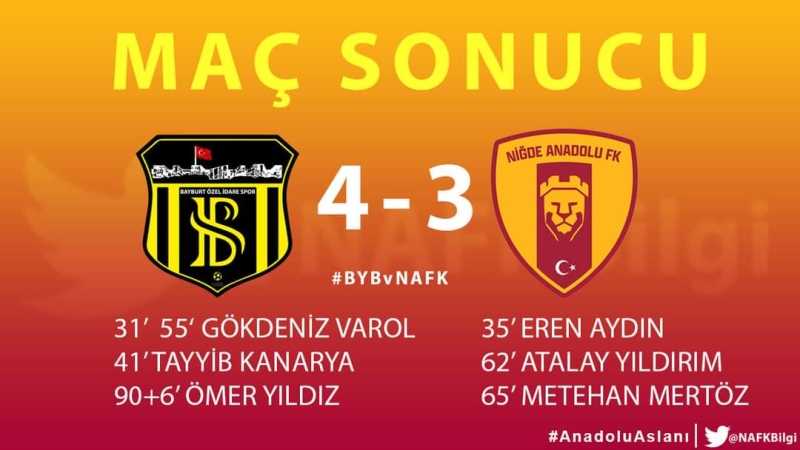 2.Lig Kırmızı grupta mücadele eden temsilcimiz Niğde Anadolu FK deplasmanda Bayburtspor'a 4-3 mağlup olarak 3.Lig'e düşmeyi garantiledi.