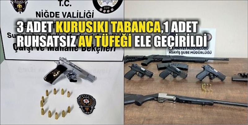 Yunus ekipleri tarafından yapılan uygulamada şüphe üzerine durdurulan bir araçta bulunan 4 şüpheli ile araçta yapılan aramalarda 3 adet kurusıkı tabanca, 1 adet ruhsatsız otomatik av tüfeği ve 1 adet tek kırma av tüfeği ele geçirildi. Şüpheliler hakkında inceleme başlatıldı.