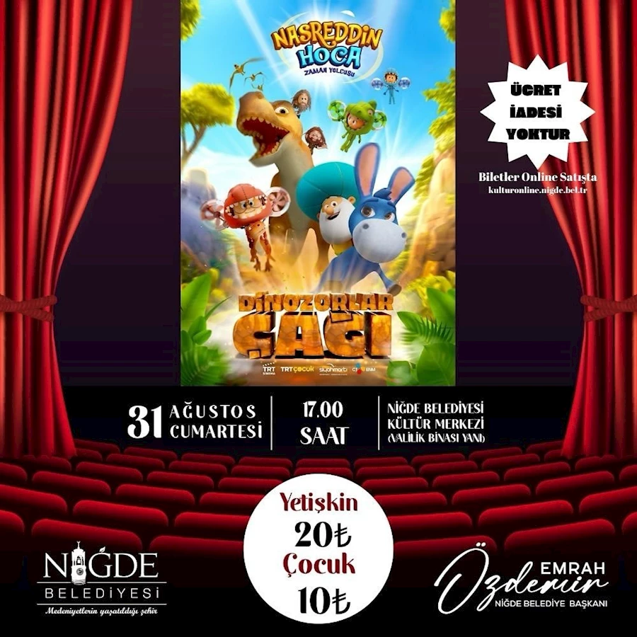 Hafta sonunda çocuklara yönelik eğlenceli etkinlikler için düğmeye basan Niğde Belediyesi 31 Ağustos Cumartesi günü 14.00’de “Kahraman Yarışçılar”, 17.00’de “Nasrettin Hoca- Dinozorlar Çağı”, 1 Eylül Pazar günü ise 14.00’de