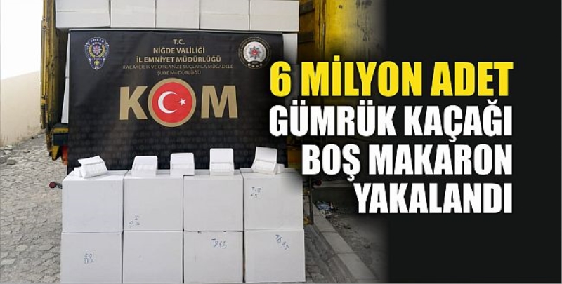 Devleti vergi kaybına uğratan kaçakçılıkla mücadele kapsamında yürütülen çalışmalarda, neticesinde İl Emniyet Müdürlüğüne bağlı Kaçakçılık ve Organize Suçlarla Mücadele Şube Müdürlüğü ekipleri Ulukışla ilçesinde gerçekleştirdikleri operasyonda başka bir araca ait plaka takılı çekicide gümrük kaçağı olduğu belirlenen 6 milyon adet boş makaron ele geçirdi.