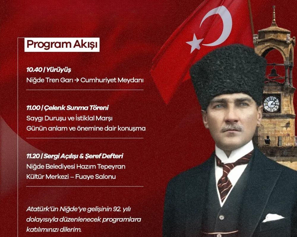 Atatürk’ün Niğde’ye gelişinin 92. yıl dönümü dolayısıyla düzenlenecek anma programı kapsamında gerçekleştirilecek etkinliklerin program akışı aşağıda yer almaktadır.