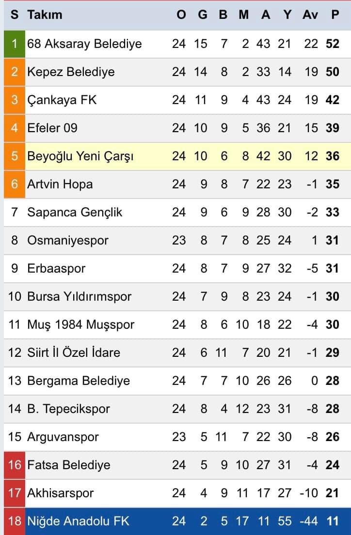 Ligde 24. hafta maçında Niğde Anadolu FK ezeli rakibi Aksaray Belediyespor la karşılaştığı maçtan 4-0 mağlup ayrıldı. Niğde Ömer Halisdemir stadında oynanan maçın ilk yarısında maça iyi başlayan grubun iddialı ekibi Aksaray Belediyespor 36. dakikada İlker’in attığı golle 1-0 öne geçti ve ilk yarı bu sonuçla kapandı. Maçta ikinci yarıda etkili oyununu sürdüren misafir takım Aksarayspor 55. dakikada Hasan’ın golüyle farkı ikiye çıkartarak durumu 2-0 yaptı. Niğde Anadolu FK oyundan iyice düşerken, Aksaray Belediyespor etkili oyununa devam ederek 69. dakikada Aykut attığı golle takımını rahatlatarak durumu 3-0 yaptı. Golden sonra oyundan kopan temsilciniz Anadolu FK, Hasan 90. dakikada kendisinin ikinci, takınının 4. golünü atarak durumu 4- 0 yaparak skoru belirledi. Haftalardır taraftarlarını kahreden Niğde Anadolu FK ülkemizde yaşanan deprem nedeniyle ligden çekilen iki takım sonrası ayağına gelen fırsatı değerlendiremedi ve en yakın rakibi Akhisarspor ile arasındaki puan farkı da 10’a çıkmış oldu. Ne ilk yarı sonunda yapılan onca yeni transfer, ne de yeni hoca takımdaki kötü gidişe çare olmadı. Tüm şehir, takımın ligde kalması için yeni tedbirlerin alınmasını istiyor. Niğdeli vatandaşlar, Niğde’nin profesyonel liglerde mücadele eden tek takımına, başta Niğde Belediyesi olmak üzere STK’lar olsun neden kimsenin sahip çıkmadığını merak ettiklerini söyledi. Bu takım BAL ligine düşerse artık bu takımı düştüğü yerden kolay kalkamaz, uzun yıllar orada kalır defi. Niğde’nin Aksaray’dan ve diğer illerden eksiği nedir bunu bu işin muhataplarına sornak istiyoruz Takım bir ilin takımı ve düştüğü duruma bakın. Biz taraftarlar olarak stadyum istemiyoruz. Biz taraftarlar olarak kahroluyoruz. Takımın olmadığı yerde stadyum ne işe yarayacak. Bu takıma sahip çıkın artık. Bu ayıp Niğde’ye yeter. Geç olmadan gelin bu takıma sahip çıkın. Niğde Anadolu FK futbolu bilen birileri tarafından ve Niğde’den yönetilsin arık dedi.