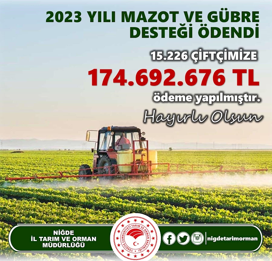 Tarım ve Orman Bakanı İbrahim Yumaklı, Türkiye genelinde 8 milyar 998 milyon 174 bin 300 lira mazot ve gübre desteği ödemesinin çiftçilerin hesaplarına aktarılacağını açıklamıştı. Bugün yapılan duyuruyla mazot ve gübre desteklerinin ödendiği Niğde İl Tarım ve Orman Müdürlüğü tarafından açıklandı.