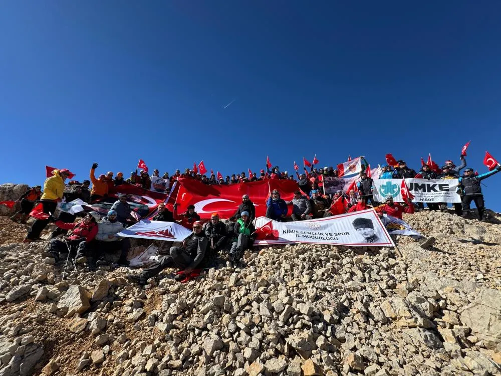 Niğde'de Cumhuriyet Bayramı'nın 101. yılı kutlamaları çerçevesinde Aladağlar'ın Emler Zirvesi'ne tırmanan dağcılar, zirvede TUSAŞ şehitlerini andı.