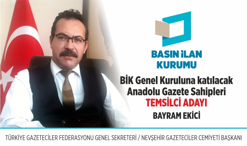 Kapadokya Muşkara Haber Gazetesi Sahibi Bayram Ekici, Basın İlan Kurumunun yerel gazetelerin temsilci seçim sürecine girildiğini hatırlatarak, Türkiye Gazeteciler Federasyonu, Türkiye Basın Vakfı ve Türk Dünyası Gazeteciler Federasyonunun desteklerinin yanı sıra, gazete sahiplerinin de destekleriyle Basın İlan Kurumu (BİK) Anadolu Gazetecileri Temsilcisi adayı olduğunu açıkladı.