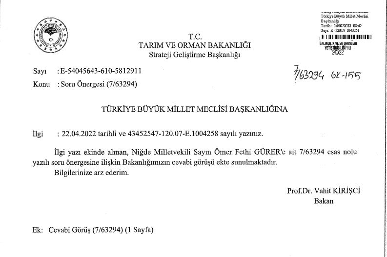 Yapay etle ilgili olarak Tarım ve Orman Bakanına yönelttiği soru önergesine Bakanın verdiği yanıtta, "Birleşmiş Milletler Gıda ve Tarım Örgütü verileri hücresel kökenli et üretiminin 2030 yılında toplam et üretiminin yüzde 10'unu karşılayacağı tahmin ediliyor; ülkemizde de bu yönde çalışma yapılıyor” şeklinde ifadeler yer aldığını aktaran Ömer Fethi Gürer, “Hani karbon salınımıyla hayvancılığı azaltalım derken, meralar bir taraftan yok edilirken, yapay etin piyasasına da pazarına da yol mu açılıyor diye insan düşünmeden edemiyor” diyerek, bu konuyla ilgili endişelerini anlattı.