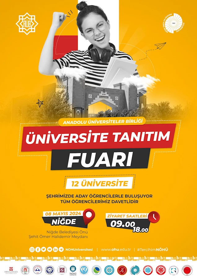 Her yıl Anadolu Üniversiteler Birliği (AÜB) tarafından birlik üyesi 16 üniversitenin katılımıyla tertip edilen “AÜB Üniversite Tanıtım Fuarları”, bu yıl da 11 ilde gerçekleştirilecek. Fuarın Niğde ayağı ise üç yıldır birliğin mensubu olan Üniversitemizin ev sahipliğinde düzenlenecek. 8 Mayıs 2024 Çarşamba günü Şehit Ömer Halisdemir Meydanı Niğde Belediyesi Önü’nde gerçekleşecek fuarda Üniversitemizin standıyla birlikte Abdullah Gül Üniversitesi, Amasya Üniversitesi, Erciyes Üniversitesi, Erzincan Binali Yıldırım Üniversitesi, Fırat Üniversitesi, İnönü Üniversitesi, Kayseri Üniversitesi, Kırşehir Ahi Evran Üniversitesi, Malatya Turgut Özal Üniversitesi, Nevşehir Hacı Bektaş Veli Üniversitesi, Sivas Bilim ve Teknoloji Üniversitesi, Sivas Cumhuriyet Üniversitesi, Tokat Gaziosmanpaşa Üniversitesi, Yozgat Bozok Üniversitesi ve Ardahan Üniversitesi tanıtım stantları yer alacak.