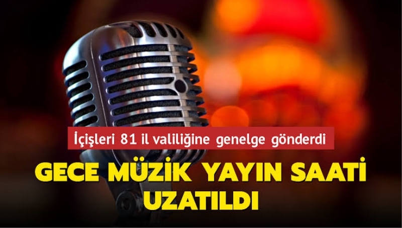 İçişleri Bakanlığı, 81 il yönetimine bu konuda bir genelge gönderdi. Genelgede, 'Pandemi sürecinde saat 24.00'te sona erecek şekilde belirlenen müzik yayın saatinin yaklaşan yaz mevsimi ve beraberindeki turizm hareketliliğine bağlı olarak uzatılmasına dair talepler Sağlık Bakanlığı, Çevre, Şehircilik ve İklim Değişikliği Bakanlığı, İçişleri Bakanlığı ile Kültür ve Turizm Bakanlığınca birlikte değerlendirildi ve müzik yayın saati gece 01.00'e kadar uzatıldı.' denildi