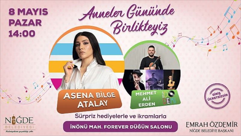 8 Mayıs Pazar günü saat 14.00 ‘de İnönü Mahallesi Forever Düğün Salonunda gerçekleştirilecek olan ve katılımın ücretsiz olduğu programa sanatçı olarak Asena Bilge Atalay ve Mehmet Ali Erden katılacak. Sürpriz hediyelerle ve ikramlarla dopdolu olan programda annelerimiz doyasıya eğlenecekler.