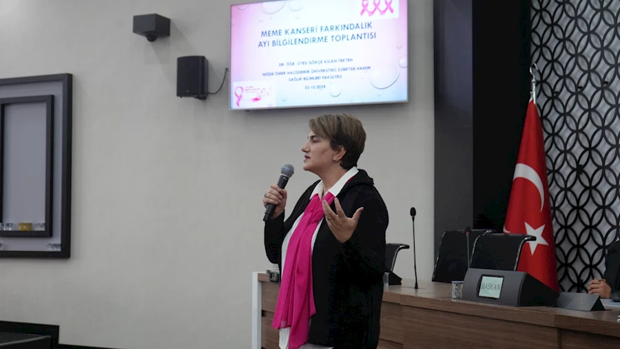 Niğde Ömer Halisdemir Üniversitesi Kadın ve Aile Sosyal Politikalar Uygulama ve Araştırma Merkezi ve Zübeyde Hanım Sağlık Bilimleri Fakültesi Ebelik Bölümü Dr. Öğretim Üyesi Gökçe Aslan Tekten tarafından, Belediye Meclis Salonundaki eğitim toplantısında meme kanserinin nedenleri, belirtileri, tedavi yöntemleri ve erken teşhisin önemine ilişkin kapsamlı bir sunum yapıldı.