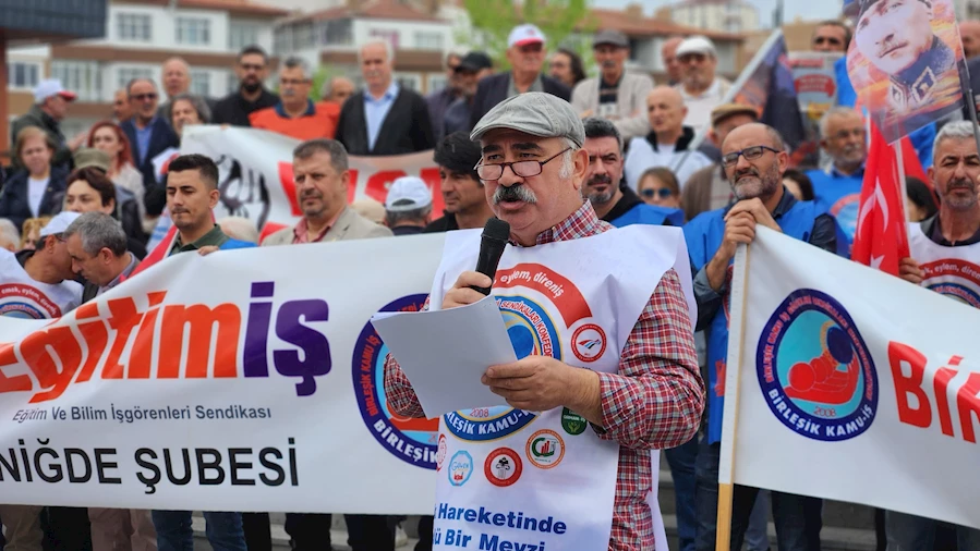 Eğitim İş Sendikası Niğde Şube Başkanı Timur Özkan yaptığı konuşmada, "Bizim bizim mücadelemiz üreten kalkınmış bir Türkiye'de adam gibi paylaşmak mücadelesidir. Kısa çöpün uzun çöpten hakkını alma mücadelesidir. Biz halkız, haklıyız, ve kazanacağız" dedi.