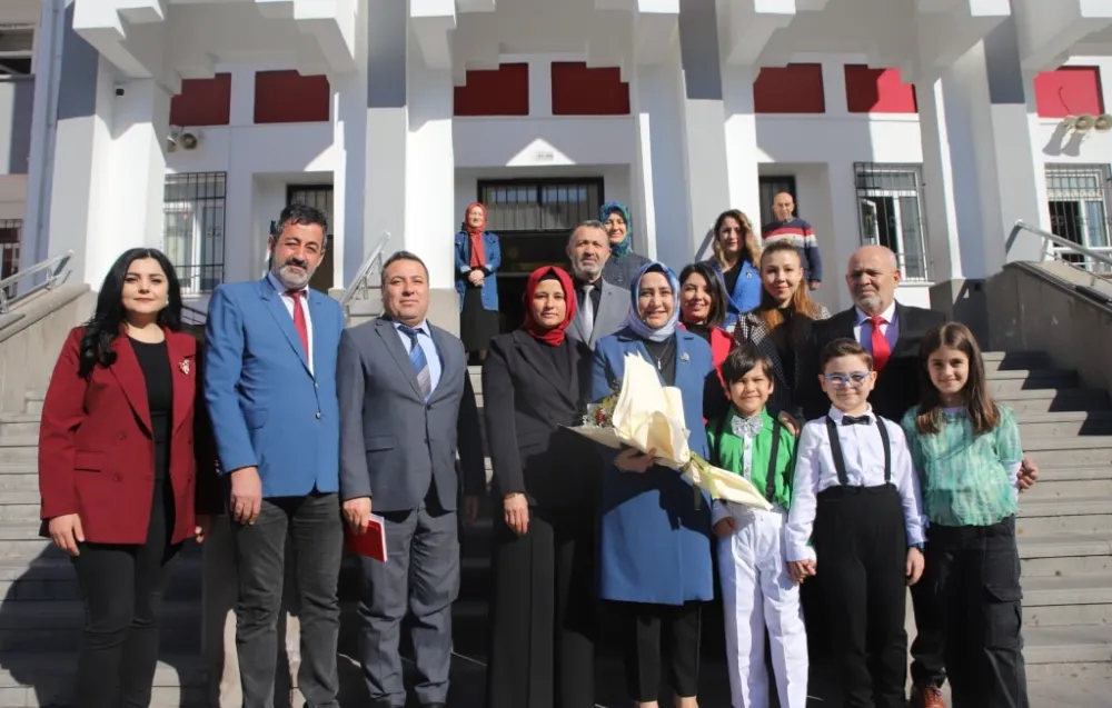 İl Milli Eğitim Müdürü Elif Özbek'e öğrenciler buket verirken, Kemal Aydoğan İlkokulu Müdürü Ömer Çomruk tarafından tablo takdim edildi.