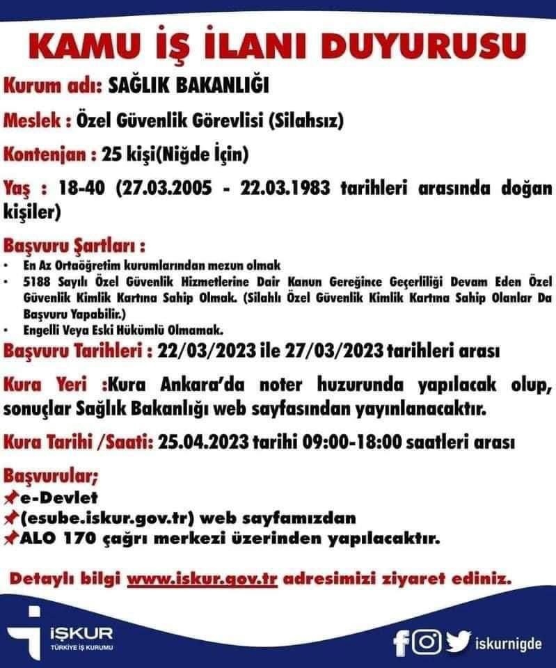 Sağlık Bakanlığı Niğde'de noter kurası ile 82 personel alacak. Sağlık Bakanlığı Türkiye genelinde 10 bin personel alacağını açıkladı. Niğde’ye 46 temizlik görevlisi, 25 özel güvenlik görevlisi, 6 klinik destek elemanı, 1 biyomedikal, 1 elektrikçi, 3 hasta karşılama ve yönlendirme personeli olmak üzere toplamda 82 personelin işe alınacağı duyuruldu. Başvuruların 22-27 Mart tarihleri arasında e-Devlet, Alo 170 ve İŞKUR internet sitesi üzerinden yapılacağı bildirildi.