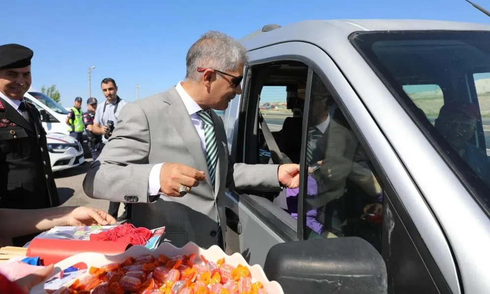 Durdurulan araçlardaki çocuklara araçta trafik kuralı ihlal edildiğinde çalarak ailelerini uyarmaları için kırmızı düdük hediye eden Vali Cahit Çelik, sürücüleri emniyet kemeri takma ve aşırı hız yapmama konusunda uyardı.